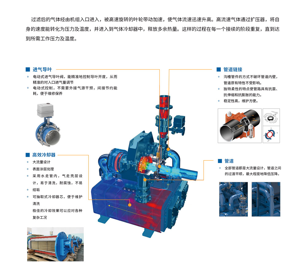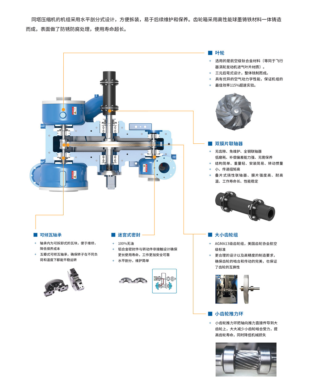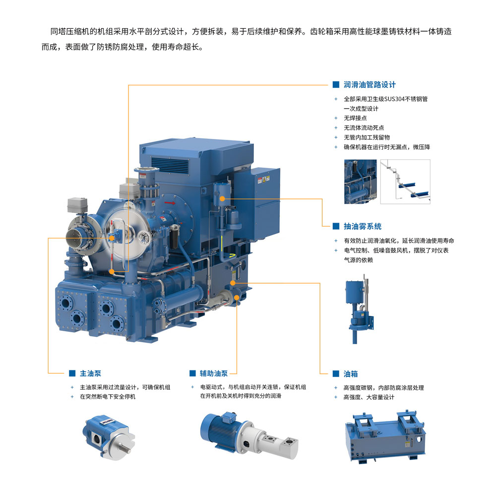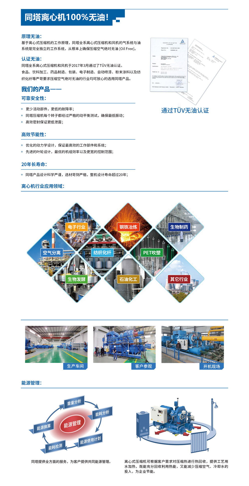 同塔公司通过自身多年实践的积累,自主研发的全系离心式压缩机、单级高速离心风机等系列产品广泛应用于空气分离、食品发酵、纺织化纤、电子半导体等行业,已通过中国质量认证中心 ISO9001:2015质量管理体系认证、TüV无油认证、CQC认证、CE认证,成功获得50多项国家发明专利和新型实用技术专利。
